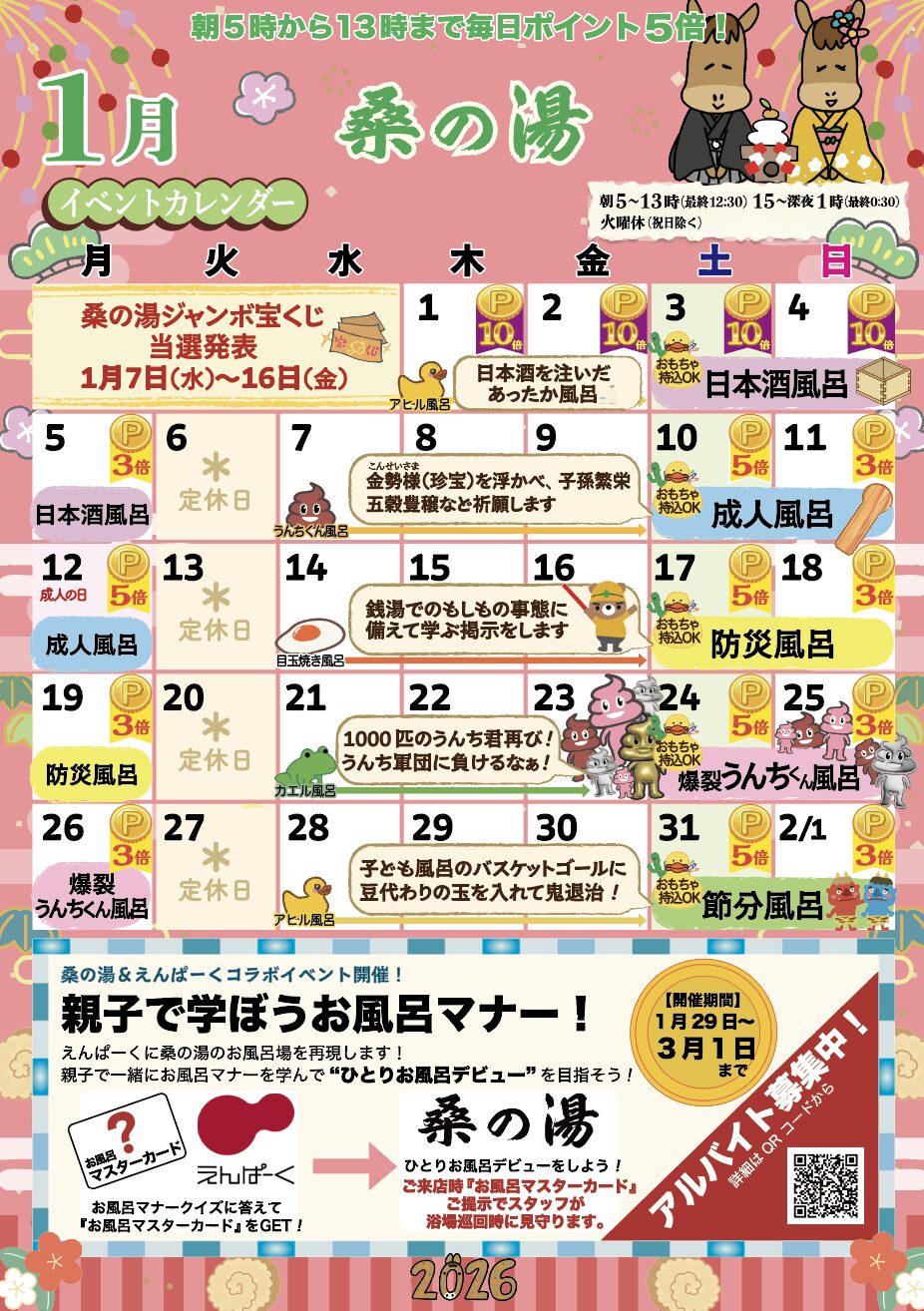 2025.12.292026年1月イベントカレンダー Post Share Hatena Pocket RSS feedly Pin it 2025年12月イベントカレンダー【12月30日〜1月3日】桑の湯1...